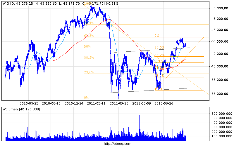 Na tygodniowym wykresie WIG nie widać póki co nic strasznego, ot zwykłe odbicie od linii bessy i połowy czarnej świecy z sierpnia 2011 roku: